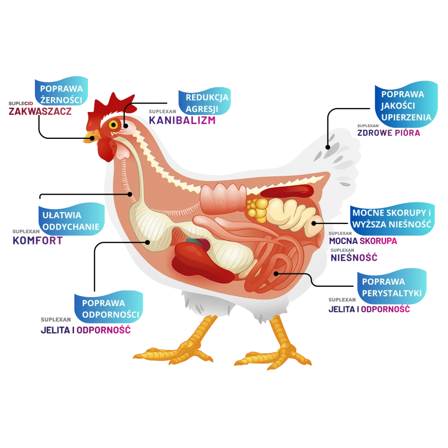 SUPLEXAN KANIBALIZM wspiera układ nerwowy poprzez dostarczenie niezbędnych minerałów: magnezu, sodu i potasu. Zawartość olejków eukaliptusa, paczuli oraz lawendy znanych ze swoich właściwości uspokajających wpływa korzystnie na równowagę psychiczną, co przekłada się na zdrowie i zachowanie ptaków dzięki czemu poprawia także wydajność produkcyjną.